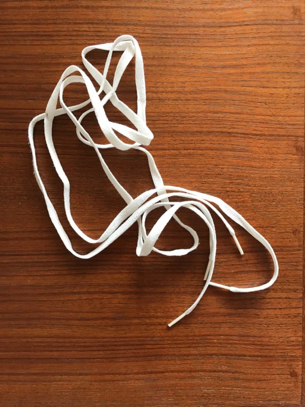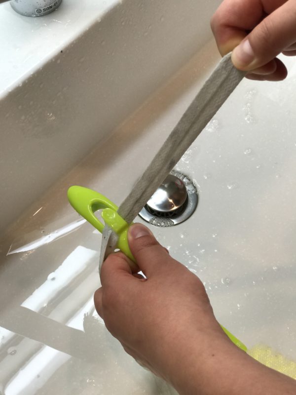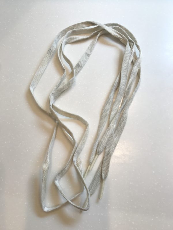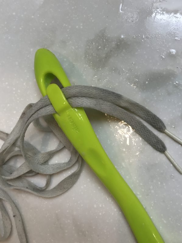 端から端へと引っ張るだけで、本当に汚れが目に見えて落ちてくるんです!! この洗面台の黒いしみはすべてくつ紐から生まれたもの。