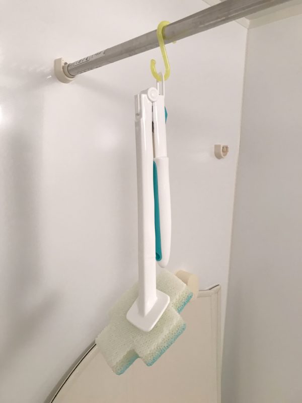もちろん、スポンジは柄にくっつけて浴室に置いておいてもよし。折りたたみの部分に引っ掛け用の穴がついているので、吊るしてコンパクトに収納できるのがとっても便利♪。