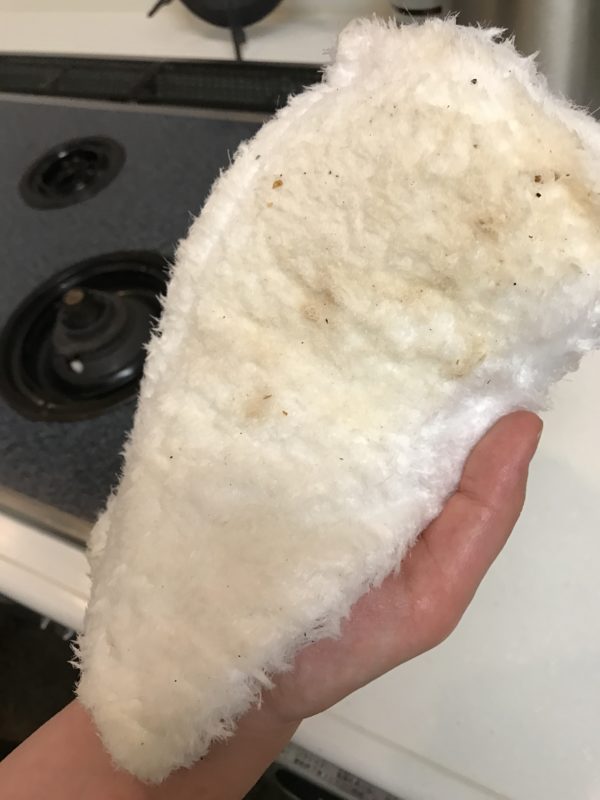 大判で、二つ折りにしても手より大きいサイズ感です。長い毛が汚れをからめとってくれるので、水だけで油汚れをきれいにしてくれるんだとか!