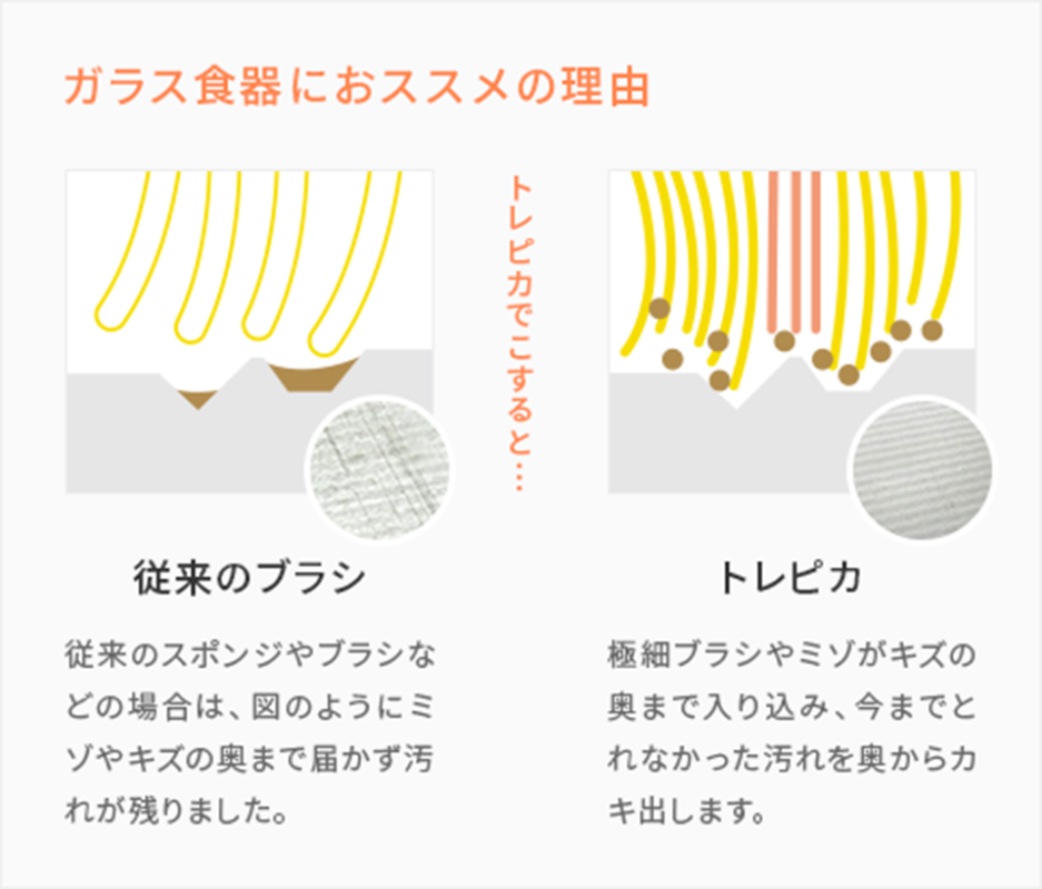 トレピカで洗うと目に見えない凸凹の隙間まで入りこみ、しっかり汚れをカキ出すので、クスミなども目立たずきれいになります。