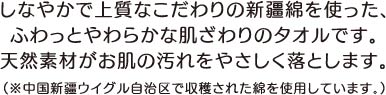 しなやかで上品なこだわりの新疆綿(しんきょうめん)を使った、ふわっとやわらかな肌ざわりのタオルです。
