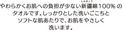 やわらかくお肌への負担が少ない新疆綿(しんきょうめん)100%のタオルです。しっかりとした洗いごこちとソフトな肌あたりで、お肌をやさしく洗います。