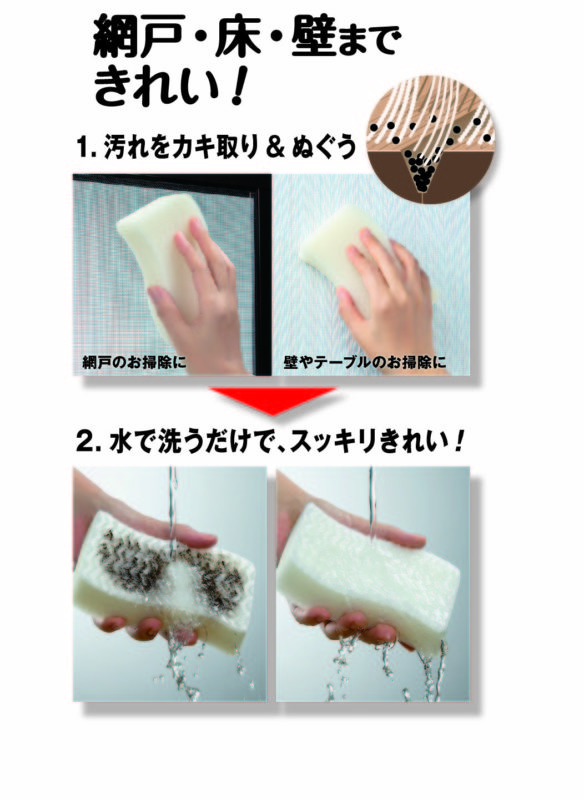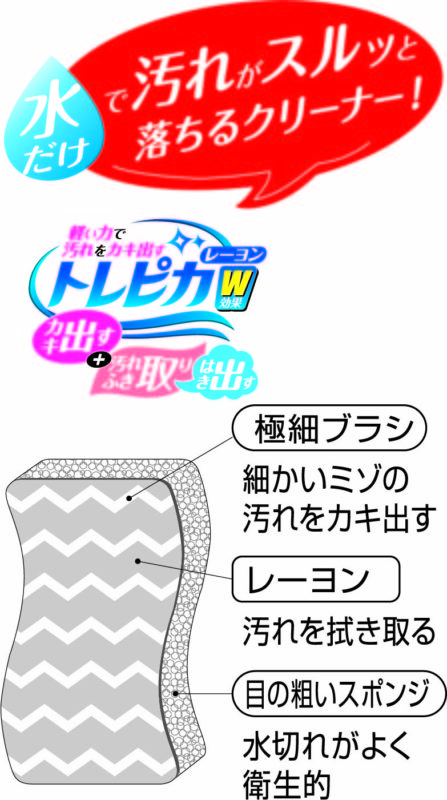 汚れをカキ出す極細トレピカと、しっかり汚れを絡めとるレーヨン素材を使用したスポンジです。