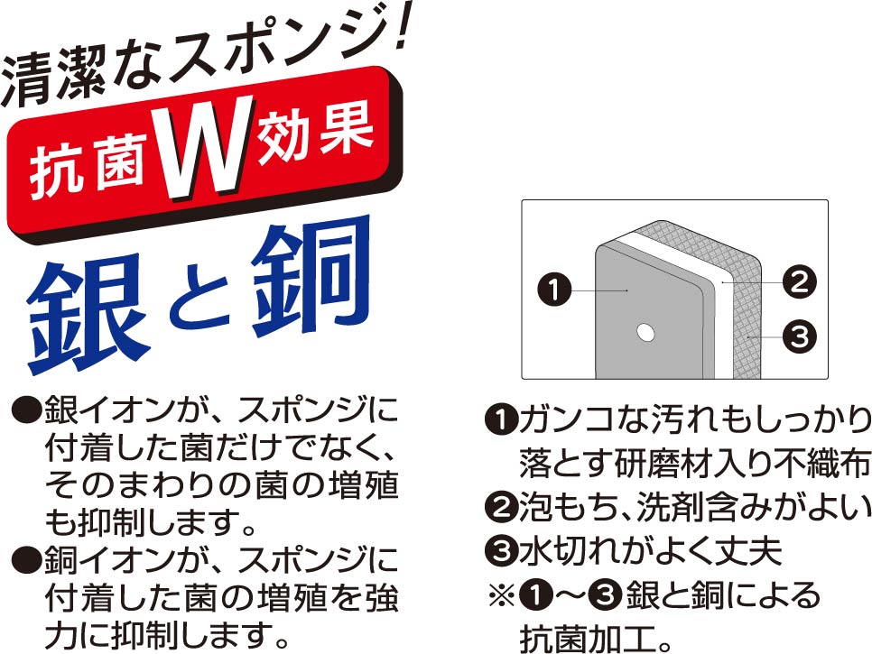 銀と銅のW抗菌により菌の増殖を抑制し、清潔さを保つスポンジです。