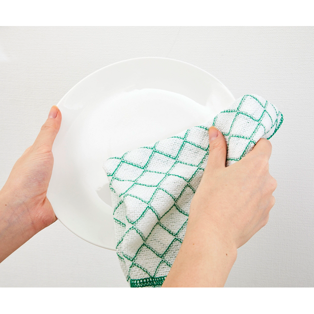 綿糸をメッシュ+低パイルで編んだ、丈夫でケバ立ちにくい仕上がりです。吸水性にすぐれ、水分や汚れをしっかり拭き取ります。