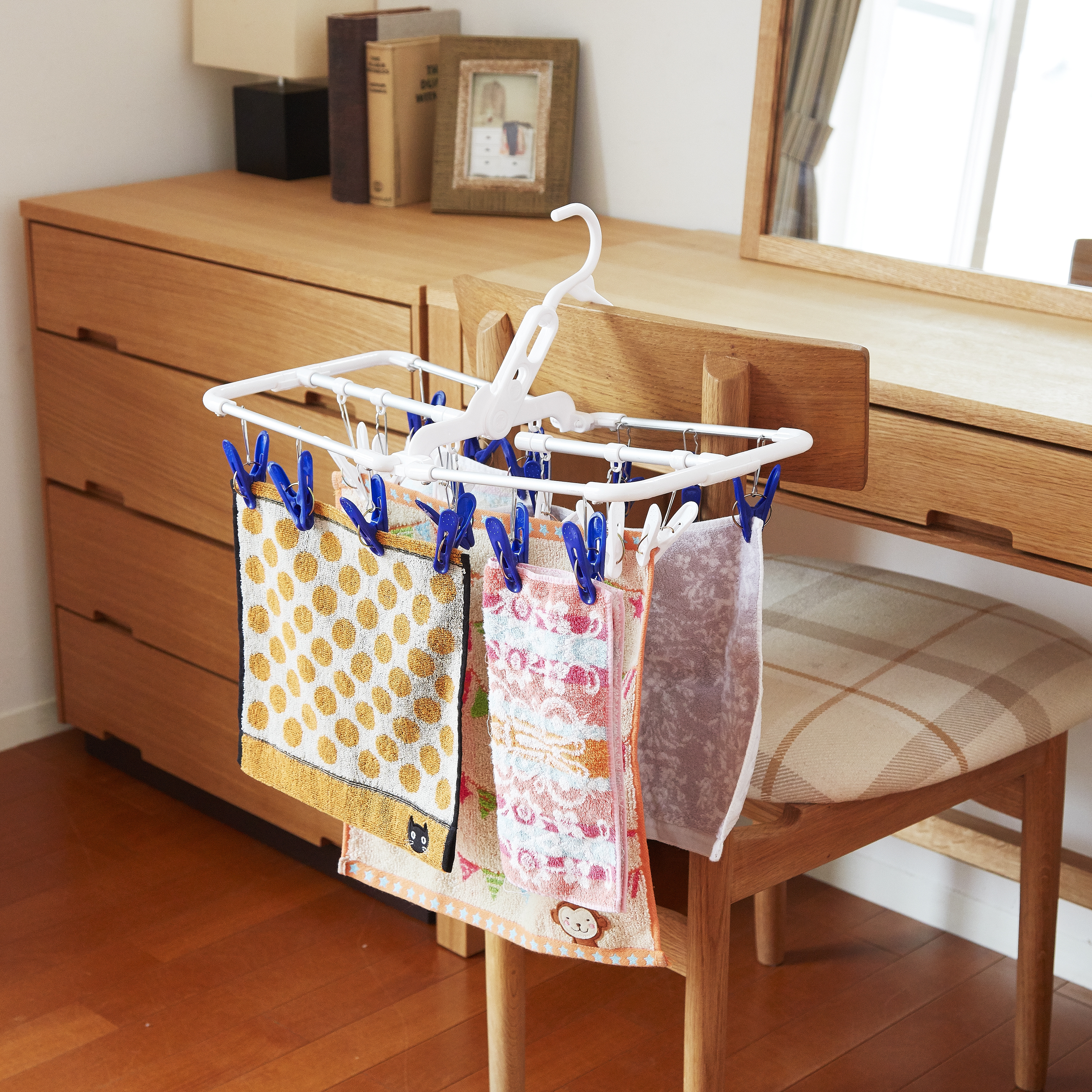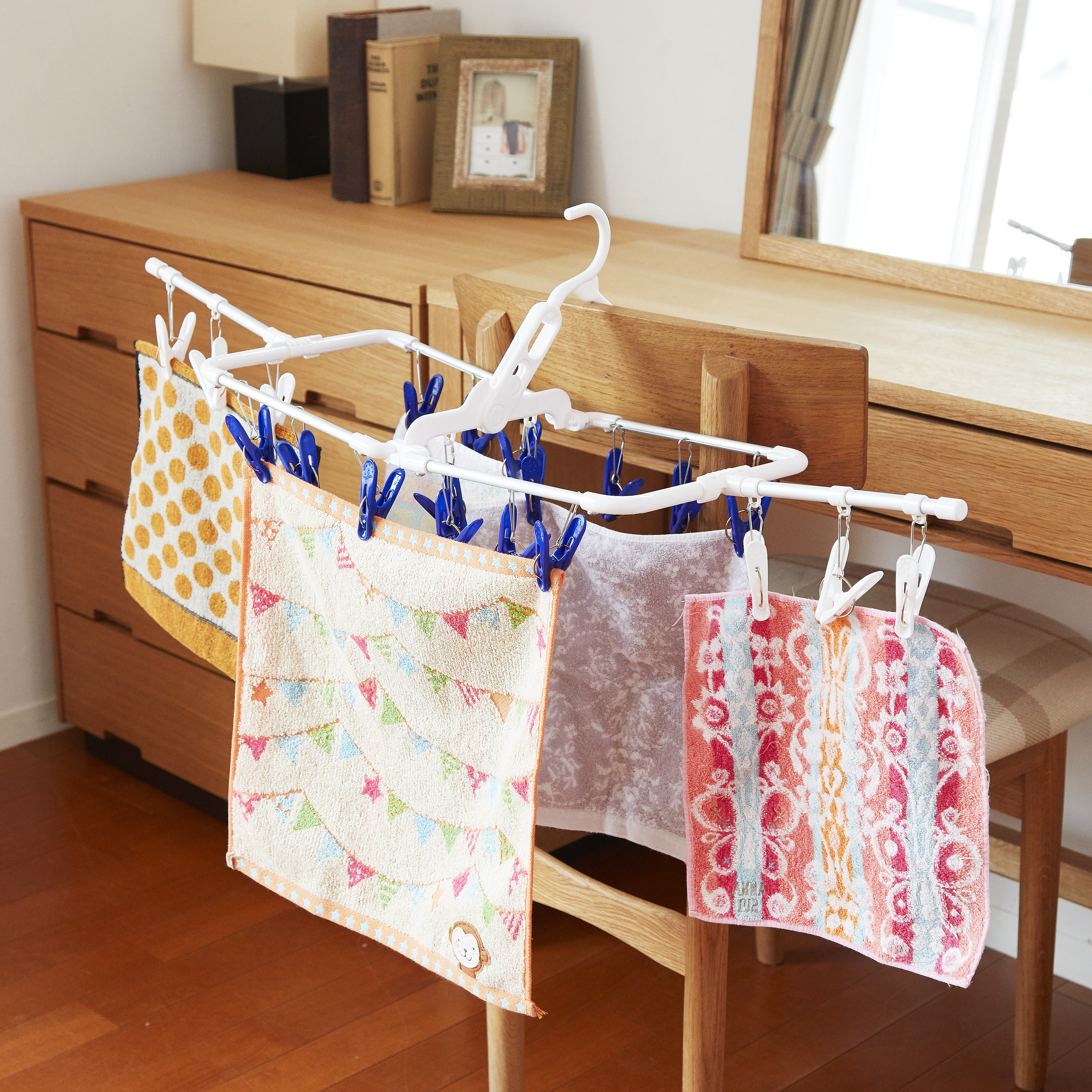・バーを広げる事で、洗濯物に風が通り、速く乾きます。フック角度が変えられて、室内の様々な場所に掛けられます。